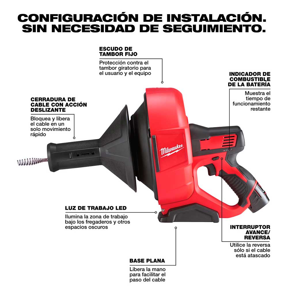 LIMPIADOR DE DRENAJE TIPO SERPIENTE M12™ KIT UPC/LAN 045242364237 INCLUYE: (1) Serpiente de drenaje M12 ™ (solo herramienta) (2571-20)(1) Cargador de batería de iones de litio M12 ™ (48-59-2401)(1) Paquete de baterías M12 ™ REDLITHIUM ™ CP1.5 (48-11-2401)(1) Cubo de almacenamiento de serpiente de drenaje de 5 galones(1) Cable de bombilla de 5/16 «X 25 ‘ (48-53-2571)