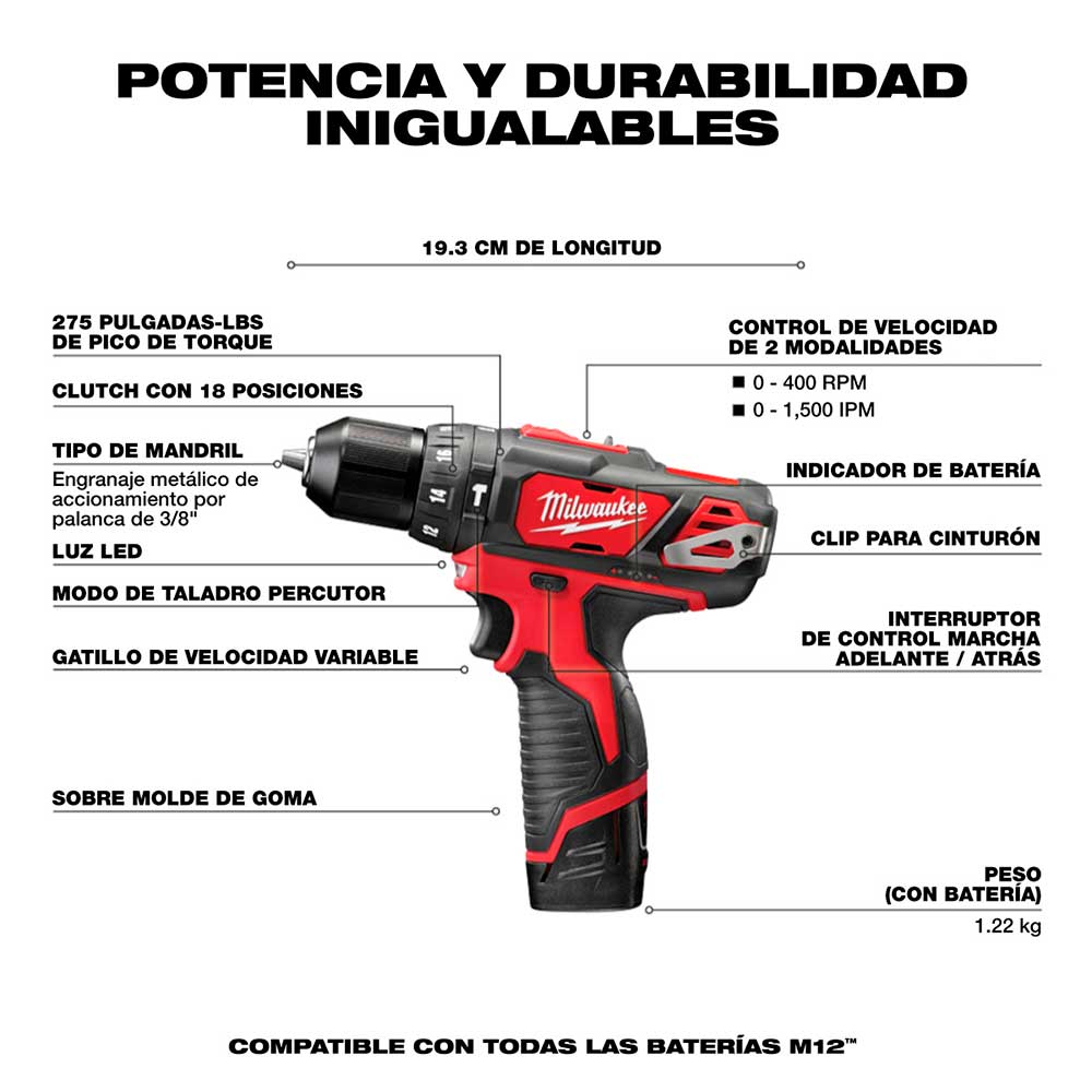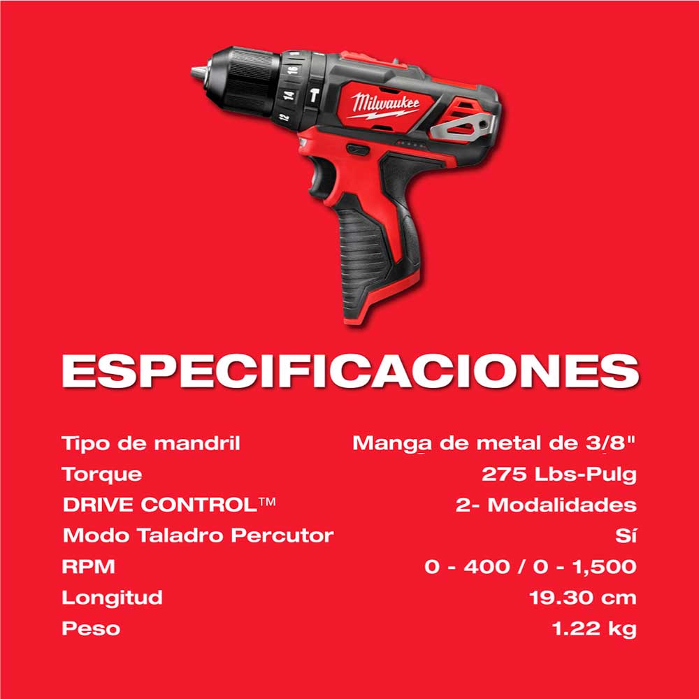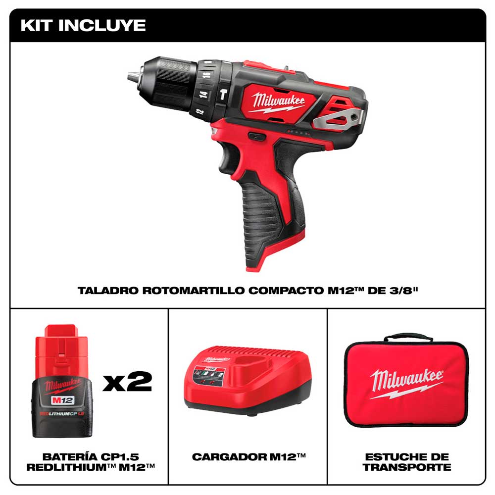 El taladro percutor MILWAUKEE M12 3/8″ es el primer taladro percutor subcompacto de la industria y ofrece la mejor potencia, velocidad y durabilidad de su clase. El taladro percutor inalámbrico compacto y ligero realiza el trabajo y es ideal para contratistas, técnicos de mantenimiento, remodeladores y profesionales que buscan portabilidad y rendimiento. El taladro atornillador con percusión ofrece a los usuarios el mejor par de apriete de su clase: 275 in-lbs y 0-400/0-1.500 RPM con la batería REDLITHIUM de 12 voltios. El portabrocas de trinquete de un solo manguito totalmente metálico proporciona a los usuarios un agarre superior de las brocas, por lo que los usuarios no tendrán que detenerse para volver a apretar las brocas ni correrán el riesgo de perderlas. El indicador de combustible integrado y la luz LED incorporada proporcionan comodidad a los usuarios y minimizan las interrupciones, incluso durante un uso prolongado. El pack de baterías REDLITHIUM proporciona más trabajo por carga y más trabajo durante la vida útil del pack que los competidores. Además del taladro percutor compacto, el kit incluye dos baterías M12 REDLITHIUM, un cargador de 30 minutos y un maletín de transporte.