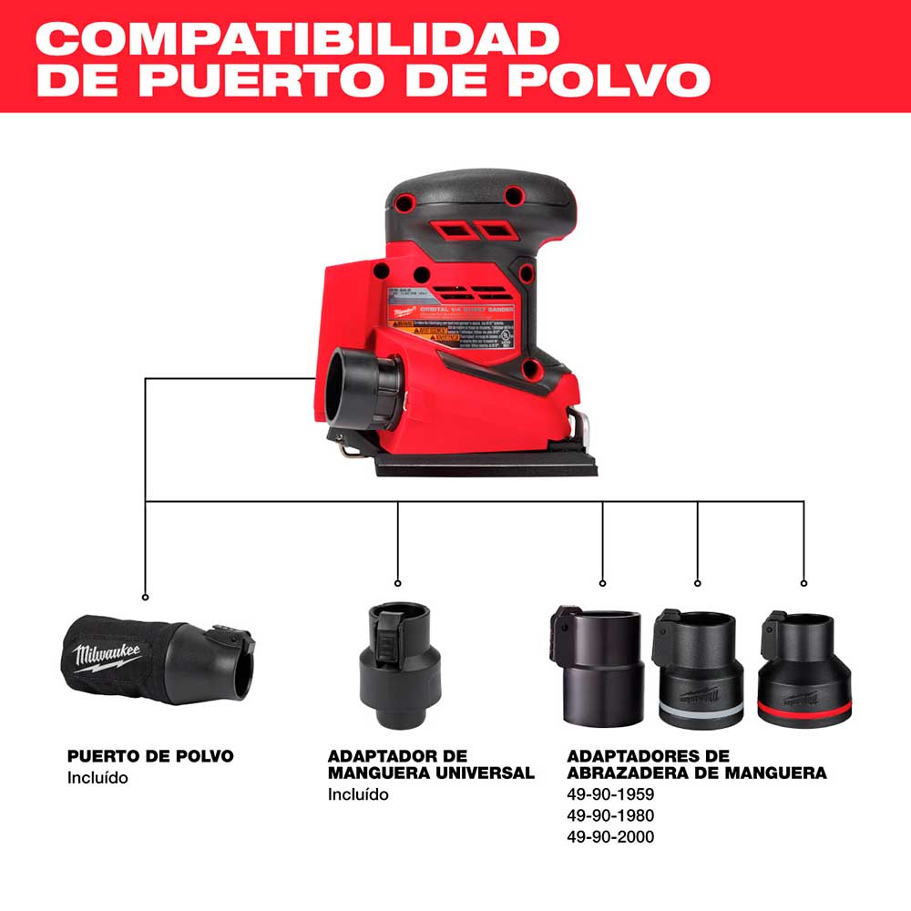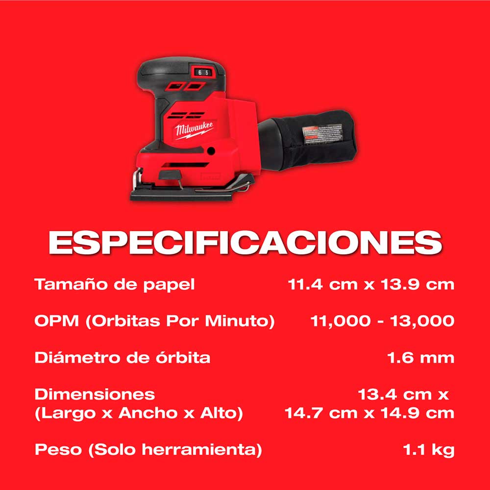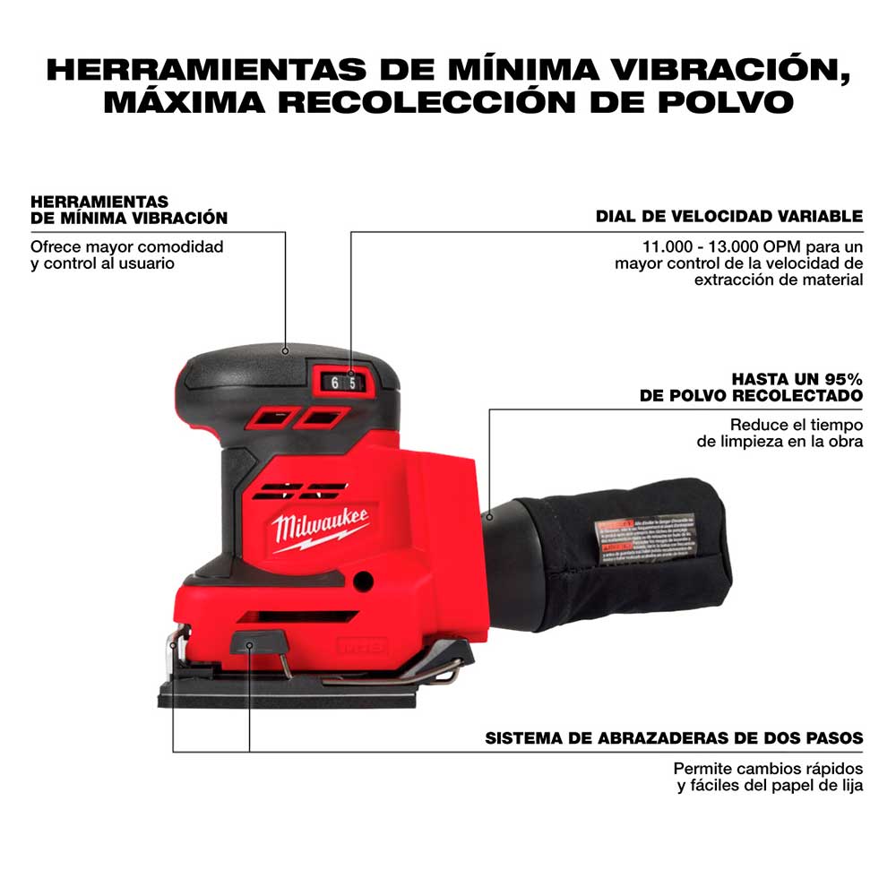 Diseñada para carpinteros profesionales, remodeladores y contratistas generales, la lijadora orbital de 1/4 de hoja MILWAUKEE® M18 está optimizada para un rendimiento y una productividad óptimos en la obra. Ofrece una potencia inigualable de 13 000 OPM (máx.) y una recolección de polvo líder en su clase, reemplazando así su unidad con cable. Su baja vibración y ergonomía brindan mayor comodidad y control al usuario, reduciendo la fatiga. El sistema de sujeción de dos pasos permite cambiar el papel de lija de forma rápida y sencilla. El dial de velocidad variable permite ajustarlo de 13 000 a 11 000 OPM para una limpieza precisa en una amplia variedad de materiales. El sistema de recolección de polvo, junto con la resistente bolsa para polvo o el adaptador universal de manguera de Milwaukee Tool, reduce el tiempo de limpieza y proporciona un entorno de trabajo más limpio.