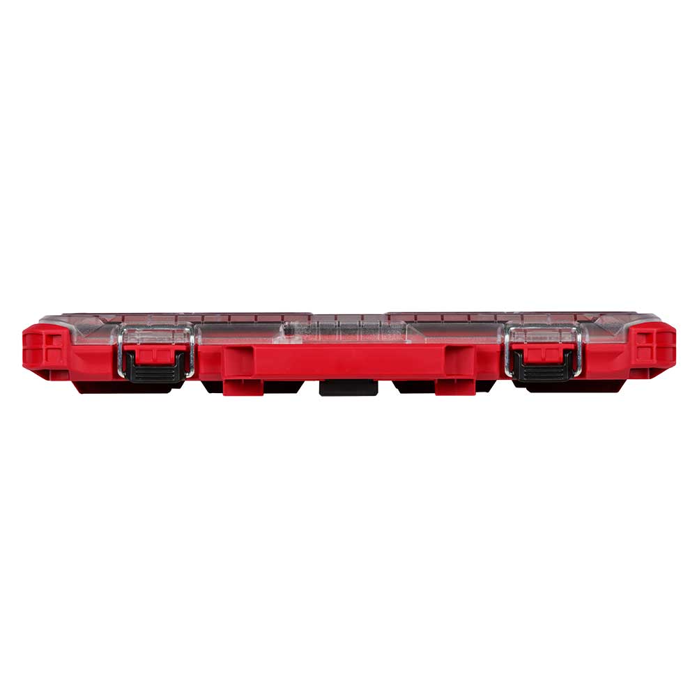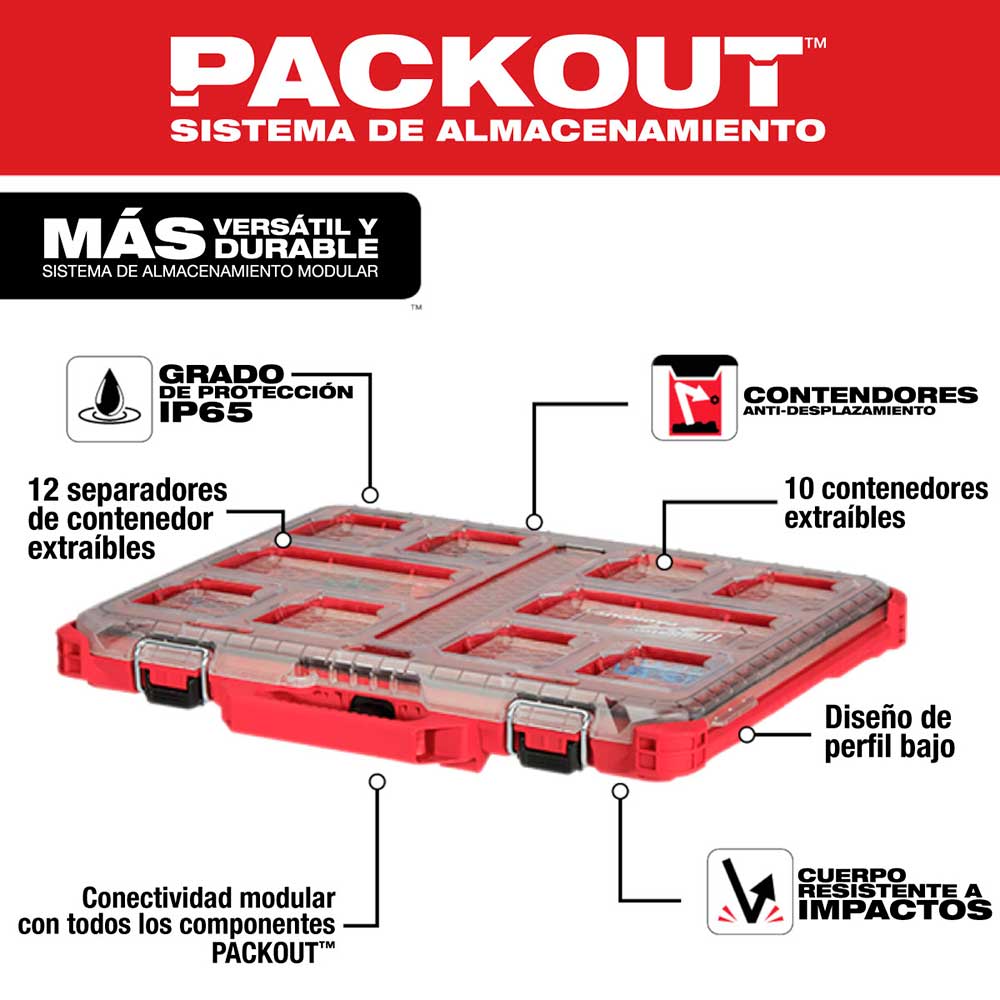 La caja de almacenaje para accesorios PACKOUT ™ está construida con materiales resistentes a los impactos, por lo que puede soportar ambientes hostiles en el lugar de trabajo. Cuenta con un sello de protección contra la intemperie con clasificación IP65 el cual protege sus herramientas, accesorios y piezas pequeñas de la lluvia y otros desechos del lugar de trabajo. El interior del organizador de poca profundidad cuenta con 10 compartimientos de almacenamiento extraíbles con divisores extraíbles y tapa transparente, que sella los contenedores para evitar que el contenido migre y se mueva durante el transporte. Los cierres resistentes y las bisagras reforzadas aseguran que el organizador delgado mantenga el contenido protegido. El almacenamiento modular PACKOUT permite a los usuarios personalizar y construir su propio sistema de almacenamiento para transportar y organizar fácilmente herramientas y accesorios.
